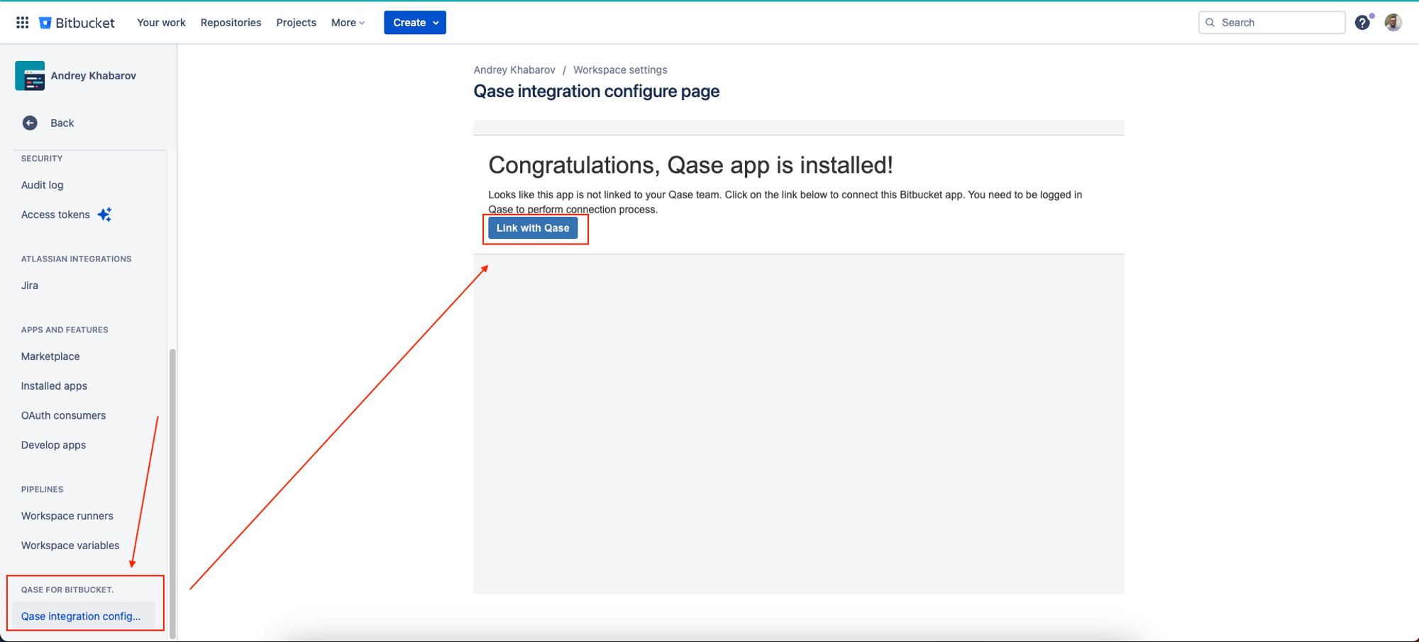 Scroll down the right panel until you see “Qase for Bitbucket”. Click the “Qase integration config…” and after that, click on the “Link with Qase” button: