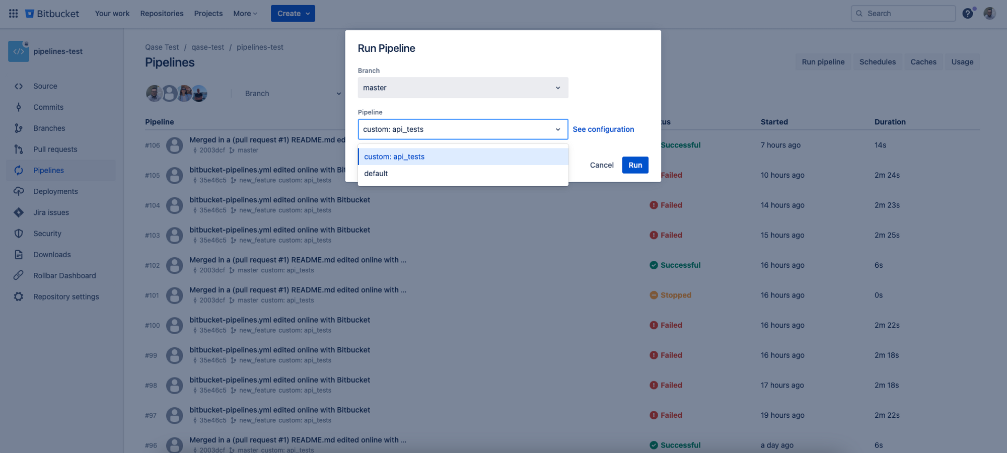 You only need to do this once. Once added, this Pipeline will appear in the drop-down list and will be remembered in Qase. You can see the names of the Pipelines in your Bitbucket (Please check the instruction below to figure out how to do it)