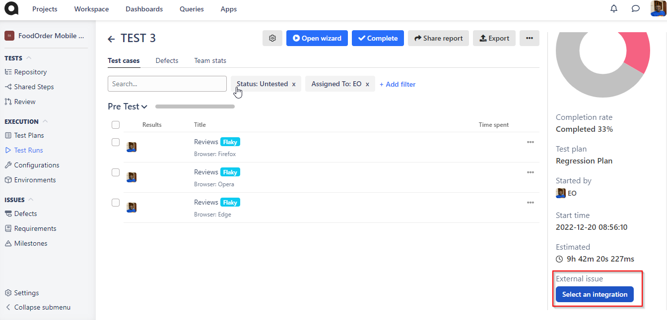 Under the "External Issues" section, click 'Select an Integration' to proceed. Only one Trello issue can be linked to the Test run.