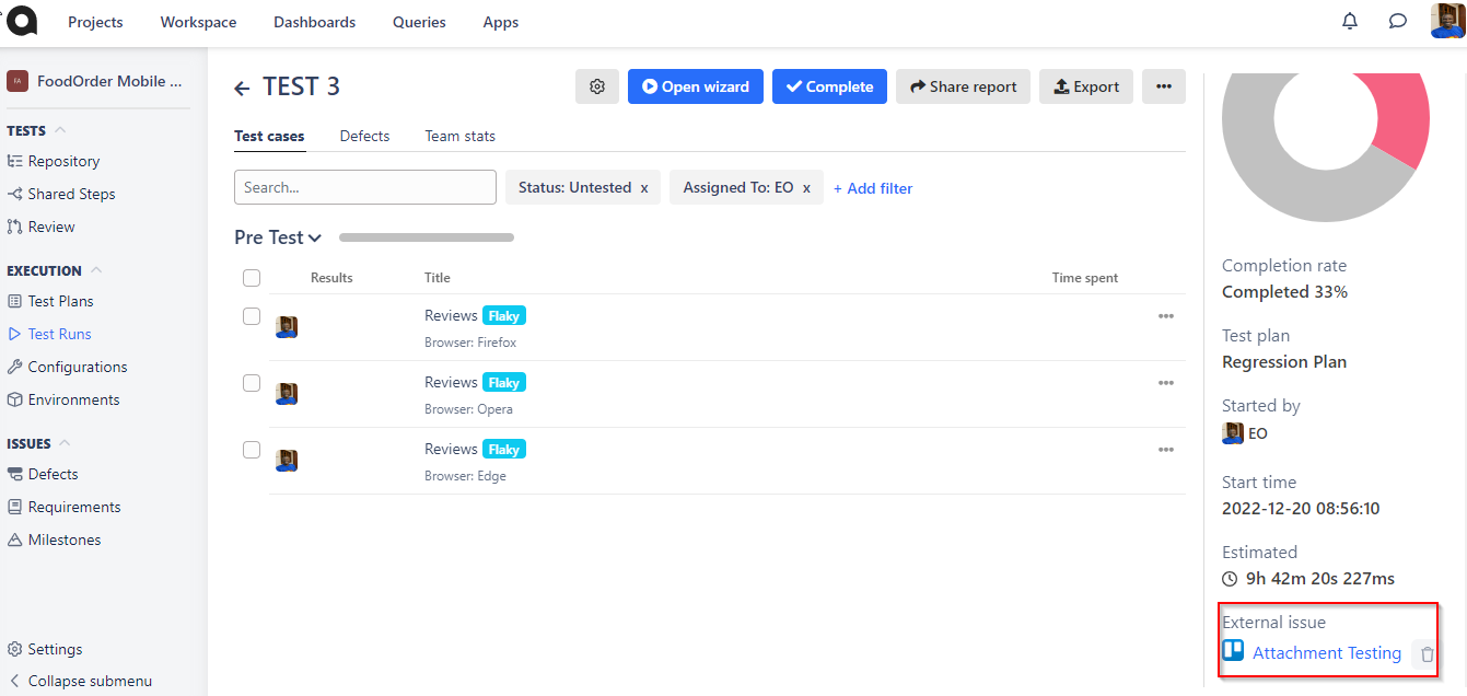 The created or linked issue will be visible in both the defects tab of the test run and the defect section of the project.