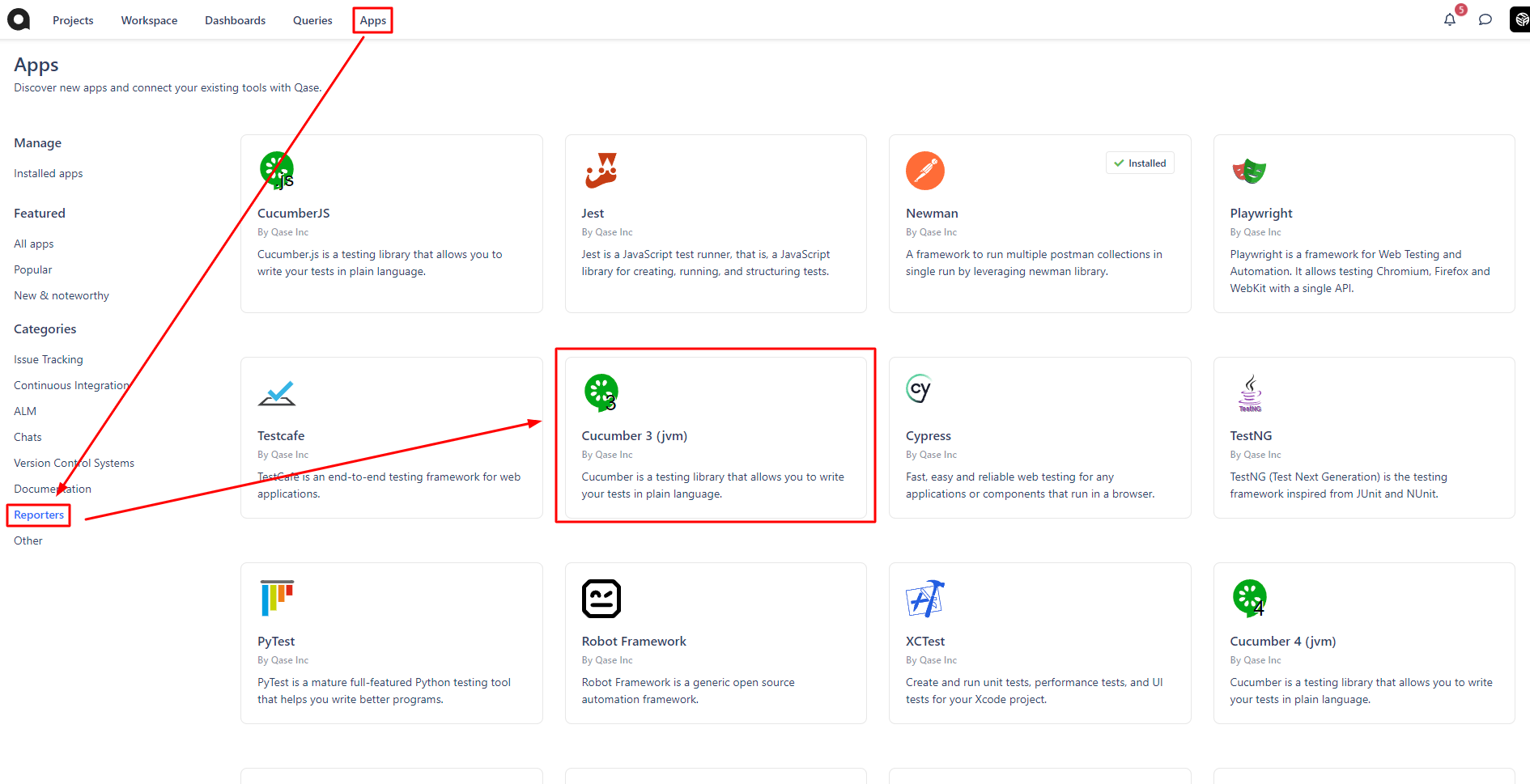 Navigate to the Apps page and switch to the "Reporters" section, then click the "Cucumber-JVM" card: