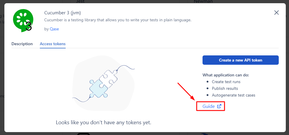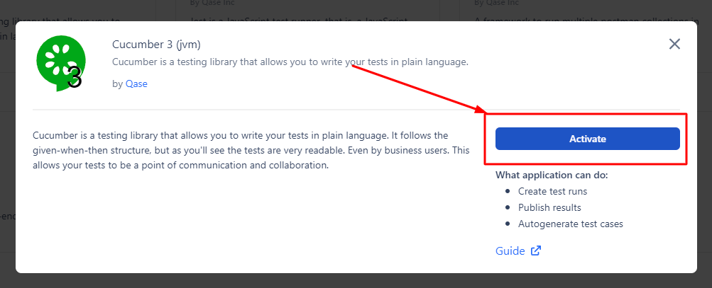Click "Guide" to access the instruction on adding the Cucumber 3 (jvm) reporter to your automation flow:
