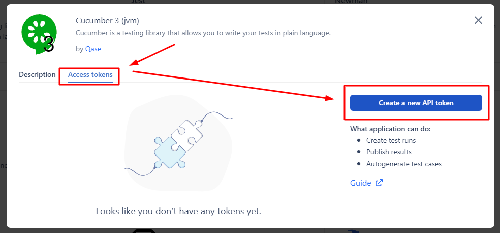 Switch to "Access Tokens" and generate an API token that the Cucumber 3 (jvm) app will be using: