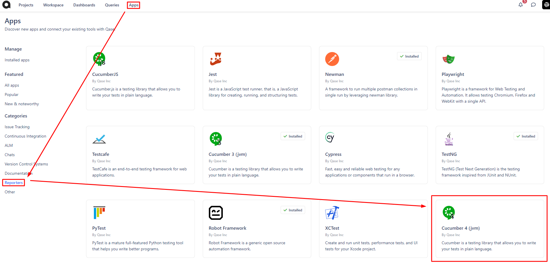 Navigate to the Apps page and switch to the "Reporters" section, then click the "Cucumber 4 (jvm)" card:
