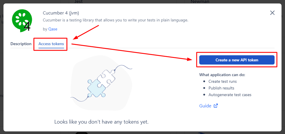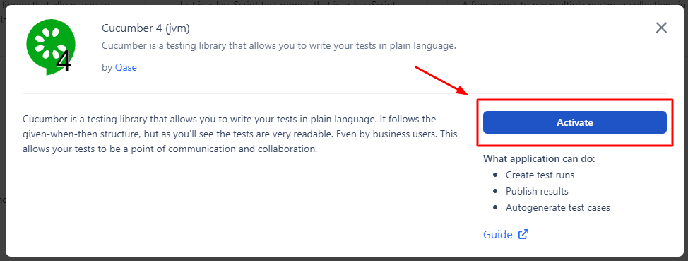 Click "Guide" to access the instruction on adding the Cucumber 4 (jvm) reporter to your automation flow: