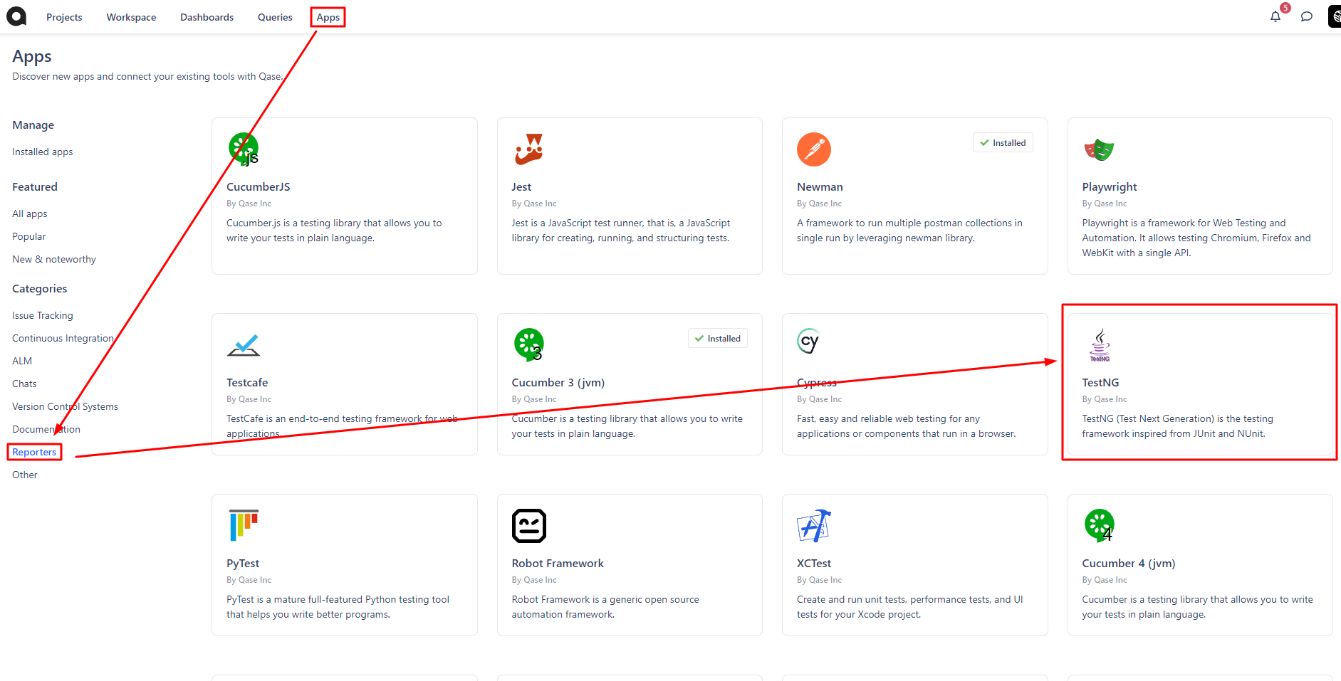 Navigate to the Apps page and switch to the "Reporters" section, then click the "TestNG" card: