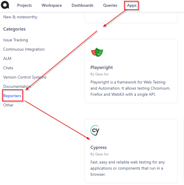 Navigate to the Apps page and switch to "Reporters" section, then click the "Cypress " card: